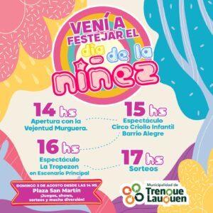 Con un amplio programa de actividades, que incluirá shows, stands con juegos y sorteos, la Municipalidad de Trenque Lauquen festejará el Día de la Niñez, el próximo domingo 3 de agosto de 14 a 17.30 en la Plaza San Martín.