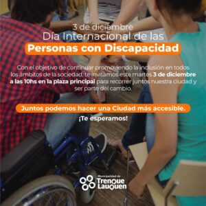 En el Día Internacional de las Personas con Discapacidad, que se celebra anualmente el 3 de diciembre, y con el objetivo de seguir promoviendo la inclusión en todos los ámbitos de la sociedad, mañana los integrantes del Hogar Cumen Che y del Centro de Día, acompañados por la directora del área, Ana Etchepare y personal de ambas instituciones recorrerán el centro de la ciudad para tomar contacto con los vecinos/as.