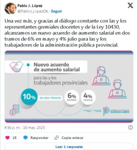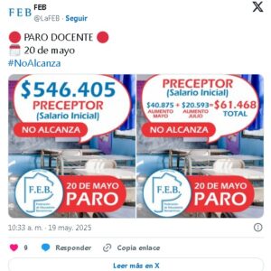 En sus redes sociales, el gremio hizo hincapié en que los $ 643.057 de salario inicial de un maestro de grado “No alcanza”, lo mismo que los $ 546.405 de un preceptor. “Ante consultas recibidas, aclaramos y ratificamos el paro del día martes 20 de mayo. El paro lo pueden hacer todos los docentes de la Provincia”, dijo la FEB en un comunicado.
