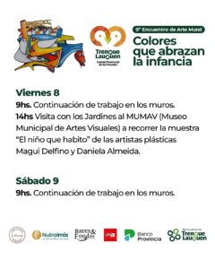 . Viernes 8: a partir de las 14, las salas de 2 años, de todos los jardines maternales municipales realizarán una visita guiada al MuMAV, a la muestra “El niño que habito” de Magui Delfino y Daniela Almeida.
