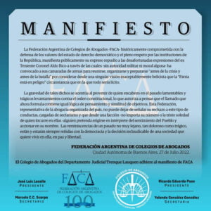“La gravedad de tales dichos se acentúa al provenir de quien encabezo en el pasado lamentables y trágicos levantamientos contra el orden constitucional, lo que autoriza a pensar que el llamado que ahora formula contiene igual lógica de pensamiento y similitud de objetivos. Esta Federación, representativa de la abogacía organizada del país, no puede dejar de señalar su rechazo a este tipo de conductas, cargadas de sectarismo y que desde una facción – no importa su número o la triste soledad de quien incurre en ellas – alguien pretenda erigirse en intérprete del sentimiento del Pueblo y accionar en su nombre. Las reminiscencias de un pasado no muy lejano, tan doloroso como trágico, están y estarán siempre reñidas con la democracia y la decisión inclaudicable de una sociedad que quiere vivir en ella, en paz y libertad”, cerró el texto de FACA.