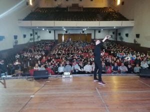 El joven Mateo Salvatto ofreció en el cine Barrio Alegre una charla sobre robótica para los últimos tres años del secundario y público en general, a sala llena, que contó con la presencia del intendente municipal, Miguel Fernández; del senador provincial Leandro Blanco; del ministro de Ciencia, Tecnología e Innovación de la Provincia de Buenos Aires, Jorge Elustondo; y el director de Tecnología e Innovación del Ministerio de Ciencia y Tecnología de la Provincia, Mariano Briolotti, y el candidato a diputado provincial, Valentín Miranda.