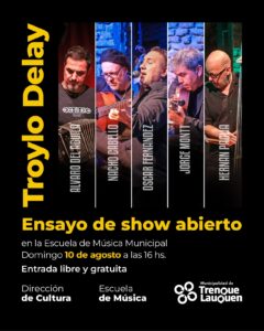 El cuarteto de tango Troylo Delay ofrecerá un ensayo de show abierto, el domingo 10 de agosto a las 16 en el auditorio de la Escuela Municipal de Música, con entrada libre y gratuita.