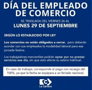 El Día del Empleado de Comercio se celebra el viernes 26 de septiembre según la Ley 26.541. Sin embargo, el sindicato y las cámaras empresariales decidieron moverlo al lunes 29 de septiembre.