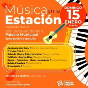 Después del éxito de la primera noche y en esta oportunidad en un escenario diferente: Frente al Palacio Municipal, el próximo domingo (15) vuelve Música en la Estación con la segunda fecha del tradicional ciclo que organiza la dirección de Cultura y Educación del municipio, con entrada libre y gratuita.