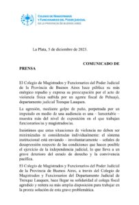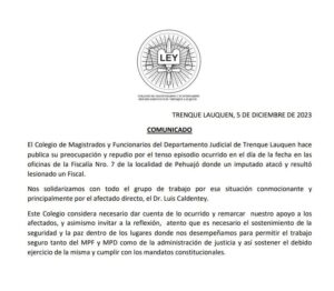LA ASOCIACION CIVIL PEHUAJENSE DE ABOGADOS repudia el hecho de violencia física padecido por el Sr. Agente Fiscal de la UFI nro. 7 Dr. Luis CALDENTEY, mientras se encontraba desempeñando sus funciones el dia 5/12/2023, al recibir en una audiencia un puñetazo por parte de un imputado; expresándole nuestra más sincera solidaridad a él, a su equipo de trabajo y a los integrantes del Ministerio Publico de la Defensa presentes en el momento de aquella conmocionante y preocupante conducta; instando a tomar conciencia de la necesidad de mantener la convivencia pacifica en la sociedad en general y en este caso especialmente en el ámbito institucional, para que la administración de justicia pueda cumplir con el mandato constitucional de impartir la misma.