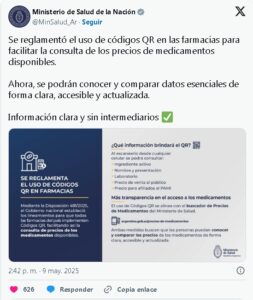El Ministerio de Salud de la Nación, reglamentó el uso de códigos QR en las farmacias para facilitar la consulta de los precios de medicamentos disponibles.