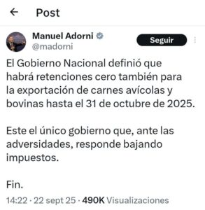 “El Gobierno Nacional definió que habrá retenciones cero también para la exportación de carnes avícolas y bovinas hasta el 31 de octubre de 2025. Este el único gobierno que, ante las adversidades, responde bajando impuestos”, apuntó en su cuenta de X el vocero presidencial.