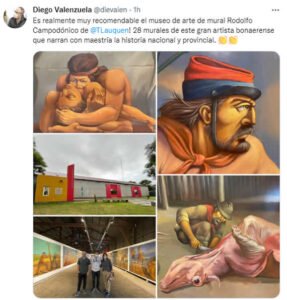 Más tarde, en otro mensaje por TW comentó: “Es realmente muy recomendable el museo de arte de mural Rodolfo Campodónico de @TLauquen! 28 murales de este gran artista bonaerense que narran con maestría la historia nacional y provincial”, con aplausos.