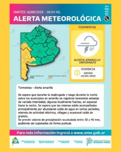 Esta alerta amarilla rige para el jueves y el viernes abarca gran parte de la provincia. Así, además de las zonas mencionadas anteriormente, la advertencia afectará a Bolívar, Carlos Casares, Carlos Tejedor, Hipólito Yrigoyen, Pehuajó, Florentino Ameghino, General Villegas, Rivadavia, Adolfo Alsina, Daireaux, Guaminí, Pellegrini, Salliqueló, Trenque Lauquen, Tres Lomas, General La Madrid, Laprida, Olavarría, Adolfo Gonzales Chaves, centro de Lobería, el norte de Coronel Dorrego, Necochea, San Cayetano y Tres Arroyos, y las costas de Lobería, Necochea, San Cayetano y Tres Arroyos.