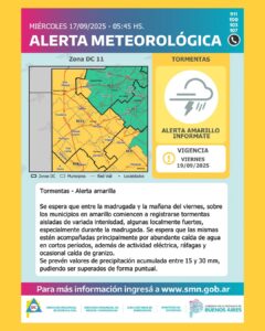 El invierno ya se despide, pero no sin mostrar fuerza: desde este miércoles las tormentas llegan a la provincia de Buenos Aires desde el sudoeste. Así, hay alerta amarilla por este motivo en todo ese extremo del territorio bonaerense, incluyendo Patagones y Bahía Blanca. Y la alerta comienza a extenderse a medida que se acerca el fin de semana, con previsión de fuertes lluvias y baja de temperatura en Trenque Lauquen y gran parte de la provincia para el sábado 20, en la previa de la primavera.