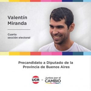 El joven dirigente radical nacido en Trenque Lauquen, Valentín Miranda, es el segundo candidato a diputado provincial por la Cuarta Sección Electoral por Juntos por el Cambio, en la boleta que acompañará al presidente Mauricio Macri, a la gobernadora María Eugenia Vidal y al intendente Miguel Fernández.