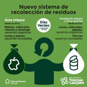 Desde el próximo lunes (18) comienza en la ciudad el nuevo sistema de recolección de residuos que pone el eje en la separación en casa con la implementación de los “Días Verdes”, y el regreso al horario nocturno: a partir de las 19 horas en Área Urbana, con la incorporación de los miércoles y el cambio de domingo por sábado, que será el único día de la semana sin servicio.