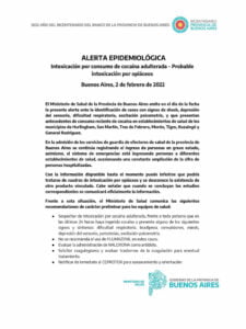 Con 17 víctimas fatales y más de 50 personas internadas por el consumo de cocaína envenenada, el Ministerio de Salud de la Provincia de Buenos Aires emitió una alerta epidemiológica “ante la identificación de casos” que presentan antecedentes de ingesta reciente de estupefacientes en establecimientos de salud de los municipios de Hurlingham, San Martín, Tres de Febrero, Morón, Tigre, Ituzaingó y General Rodríguez.