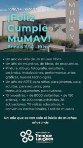 Durante este primer año se realizaron 10 muestras, por las que pasaron más de 8.000 visitantes, participaron más de 150 artistas y se exhibieron más de 200 obras. Además, se llevaron a cabo 38 activaciones, 70 visitas educativas, 4 convenios institucionales y la conformación de una red de museos, consolidando al MuMAV como un espacio de referencia cultural y artística en la región.