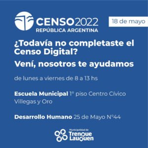 Para facilitar la realización anticipada del Censo Nacional 2022 en forma digital, la municipalidad de Trenque Lauquen dispuso que jueves y viernes de esta semana, y lunes y martes de la próxima, en el horario de 8:00 a 13:00, haya en la Escuela Municipal, en el primer piso del Centro Cívico (Villegas y Oro) y en la subsecretaría de Desarrollo Humano (25 de Mayo nº44, entre Villegas y San Martín) dos puestos con personal que ayudará a las vecinas y vecinos que se acerquen para completar la planilla correspondiente y no sepan o no hayan podido hacerlo cuando lo intentaron.