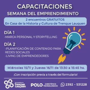 El Polo Científico Tecnológico, que funciona en Hernández nº 816, impulsa la Semana del Emprendimiento, una propuesta que contempla dos días de capacitaciones gratuitas orientadas a personas que tienen un emprendimiento en marcha o tienen una idea y quieren llevarla a la acción.