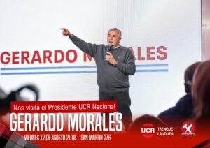 Gerardo Morales estará en el Comité de la U.C.R. Trenque Lauquen este próximo viernes 12 de Agosto a partir de las 21 horas donde será recibido por su Presidenta, Gabriela Aimar. A esa hora se concretará un acto al que también asistirán legisladores provinciales radicales e intendentes de la zona, encabezados por el jefe comunal local, Miguel Fernández.