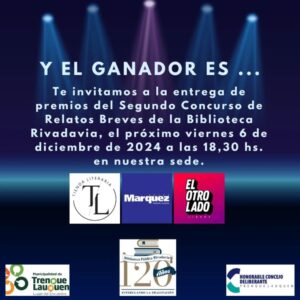 El 2do Concurso de Relatos Breves de la Biblioteca Rivadavia “La Biblioteca es puro cuento” tuvo un número récord de participantes. Fueron más de quinientas obras recibidas, provenientes de la ciudad, la zona, la provincia, el país y de varios países del exterior. El certamen, que cuenta con el auspicio del Honorable Concejo Deliberante y el apoyo de la Municipalidad, ha adquirido así rápida relevancia. Este año los premios fueron auspiciados por Tienda Literaria (que entregará el primer premio por $180.000), Grupo Marquez (el segundo premio, por $120.000) y El Otro Lado Libros (el tercer premio, por $70.000).