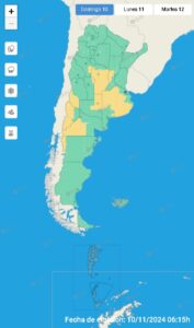 El SMN clasificó estas condiciones bajo una alerta amarilla, que implica un fenómeno meteorológico con potencial de daño y riesgo de interrupción momentánea de actividades cotidianas. Con posibilidad en algunas provincias de lluvias intensas, tormentas eléctricas, caída de granizo y fuertes vientos.