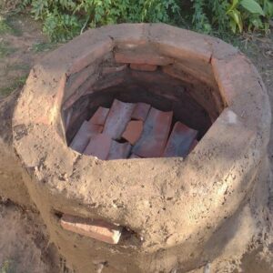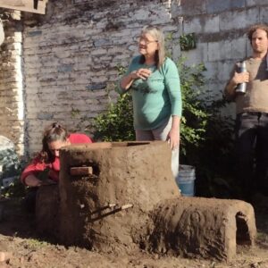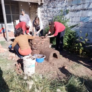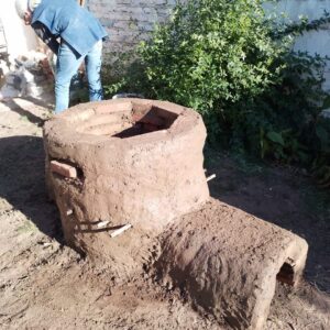 Se trata de un horno de tiro directo para hornear a leña las piezas del taller, construido con ladrillos mendocinos, adobe (preparado en la escuela) y agua de tuna como ligante.