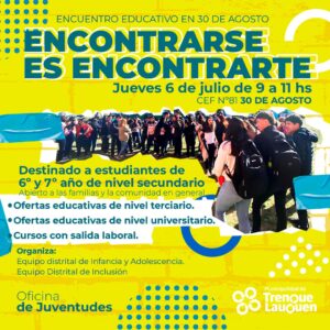 Este jueves (6) de 9:00 a 11:00 en el CEF nº 81 de 30 de Agosto tendrá lugar el Encuentro Educativo “Encontrarse es encontrarte”, destinado a estudiantes de 6º y 7º año de nivel secundario que podrán acceder e interiorizarse sobre la oferta educativa de nivel terciario, universitario y cursos con salida laboral que hay disponibles en Trenque Lauquen y la zona.