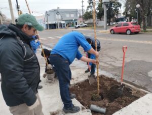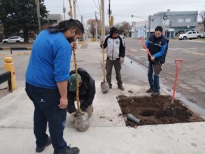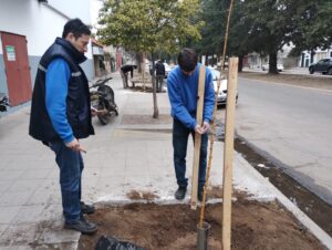 En el marco del Plan Integral de Arbolado Urbano, la dirección de Espacios Verdes del Municipio continúa con la forestación en veredas de la ciudad culminando los trabajos en las dos sucursales de la empresa La Anónima: en la ubicada sobre la avenida García Salinas donde previamente se colocaron 10 Ciruelos de flor y ahora, en la de Simini y Di Gerónimo donde se plantaron fresnos dorados.