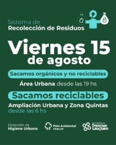 La Dirección de Higiene Urbana de la Municipalidad de Trenque Lauquen informa que el próximo viernes día no laborable con fines turísticos por la conmemoración del Paso a Inmortalidad del General José de San Martín, el servicio de recolección de residuos se prestará de manera normal en la ciudad cabecera: