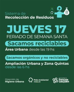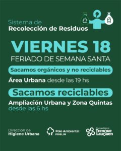 La dirección de Higiene Urbana municipal informa que el servicio de recolección de residuos se prestará de manera normal durante Semana Santa (jueves 17 y viernes 18 de abril), y solicita a la población tener en cuenta los días y horarios de la recolección en los distintos sectores: Zona Urbana, Zona Quintas y Ampliación Urbana.