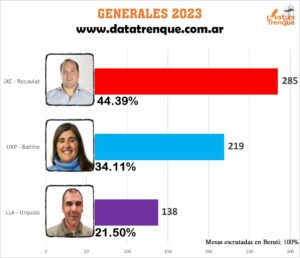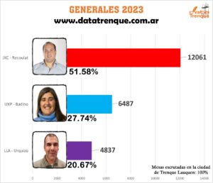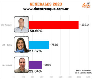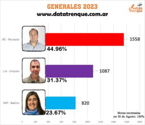 Con el 100% de las mesas escrutadas, el candidato de Juntos por el Cambio, Francisco Recoulat, se impuso por un porcentaje superior al 50% (50,60%) y se convirtió en el nuevo Intendente del distrito de Trenque Lauquen.