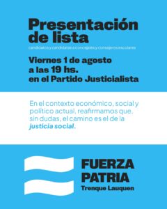 Fuerza Patria presentará hoy a las 19 hs, en la sede del Partido Justicialista (Villegas 154), su nómina de aspirantes a concejales y consejeros escolares para las Elecciones Legislativas del próximo 7 de septiembre en Trenque Lauquen.