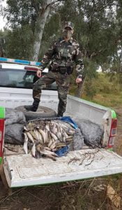 En ese momento, los agentes advirtieron que dos personas en motocicletas se daban a la fuga dejando abandonados varios bultos. Al ser requisados, se detecta que se trata de bolsas tipo cerealeras llenas de pescados, estimándose que los mismos resultan ser producto de la actividad furtiva.