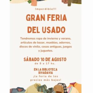 La feria del usado, se realiza este sábado 10 de agosto de 9 a 17hs en la Biblioteca Rivadavia.