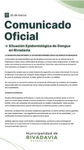 Desde la Municipalidad de Rivadavia, a través de la Secretaría de Salud, desde el mes de enero se vienen desarrollando acciones tendientes a mitigar la propagación del dengue en el distrito, tanto con campañas de concientización en medios tradicionales, redes sociales, como ámbitos educativos, postas informativas en distintos puntos y puerta a puerta.