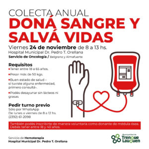 Acerca de la colecta anual, la profesional dijo que está programada para el viernes 24 de noviembre, y los interesados/as en sumarse a la campaña tendrán que sacar un turno solo por WhatsApp al (2392) 61-2098 de lunes a viernes de 8 a 12.