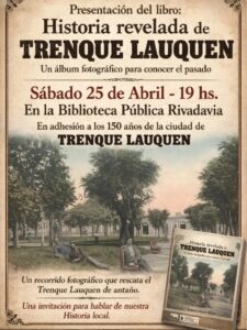 El próximo sábado 25 de abril a las 19 horas se presentará en la Biblioteca Pública Rivadavia el libro “Historia revelada de Trenque Lauquen”, del autor Roberto Oscar Mileo, en el marco de una actividad especial organizada en adhesión a los 150 años de la ciudad de Trenque Lauquen.