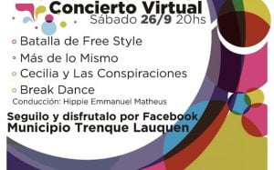 El concierto, al que se podrá acceder a través de la página de Facebook del Municipio, comenzará a las 20:00 e incluye una Batalla de FreeStyle; la presentación de las agrupaciones Más de lo Mismo y Cecilia y Las Conspiraciones y Break Dance. Tendrá en la conducción de Emmanuel Matheus, el “Hippie”.