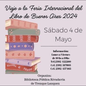 La Biblioteca Rivadavia, como cada año, suma su propuesta de visitar la Feria del Libro de Buenos Aires saliendo desde la terminal de Trenque Lauquen, el sábado 4 de mayo, a las 7 hs de la mañana para llegar al Predio de la Rural a visitar la feria a las 13:30hs.