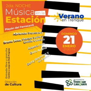 Y el domingo (21), también desde las 21 pero en el Playón del Ferrocarril será la segunda noche del tradicional ciclo Música en la Estación, también con entrada libre y gratuita: En esta oportunidad se presentarán Abriendo Fronteras; Bruno Sosa, Franco León y Emilio Campo; Áspera Folk; Elvio Acuña y Santy Reynoso y su banda. La cantina estará a cargo del Club Progreso.