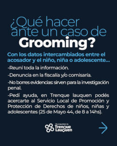 El Grooming es el contacto con una niña, un niño o adolescente a través de medios digitales con el propósito de atentar contra su integridad sexual. Es una forma de abuso sexual que ocurre enteramente en entornos digitales, y constituye un delito, aun cuando no exista el encuentro físico.