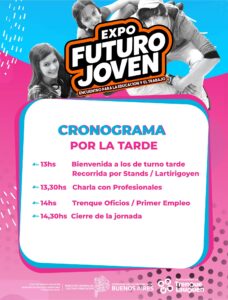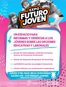 Organizada por la Municipalidad de Trenque Lauquen, a través de la subsecretaría de Producción y Desarrollo Económico y oficina de Juventudes, en conjunto con la Jefatura Distrital de Educación y Dirección de Psicología Comunitaria y Pedagogía Social, el jueves 17 de julio en Racedo n° 298, la sede de la Facultad Regional Trenque Lauquen de la UTN (ingreso por calle Avellaneda) se realizará la segunda edición de la Expo Futuro Joven.
