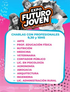 . 10.30 horas: Charlas con profesionales (Arte, Educación Física, Nutrición, Medicina, Veterinaria, Contador Público, Psicología, Agronomía, Abogacía, Arquitectura, Ingeniería y Administración Rural).