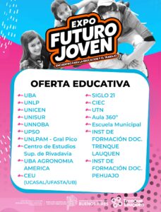 . Oferta educativa local y regional. Habrá stands de Universidades, Institutos Terciarios y Centros de Formación Profesional. Habrá stands de las siguientes instituciones: UBA, UNLP, UNICEN, UNISUR, UNNOBA, UPSO, UNLPAM General Pico, Centro de Estudios Superiores de Rivadavia, UBA Agronomía América, CEU (UCASAL/UFASTA/UB), Siglo XXI, CIEC, UTN, Aula 360º, Escuela Municipal, Institutos de Formación Docente de Trenque Lauquen (40 y 144) e Instituto de Formación Docente Pehuajó.