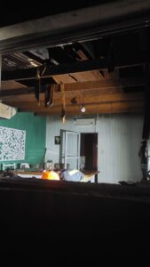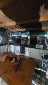 Se procede a emplazar el material contra incendio y se ingresa al interior de la vivienda a realizar tareas de extinción, una parte del cielorraso tuvo que ser sacrificada para poder retirar cartones y poder cortar la propagación hacia los demás compartimientos.