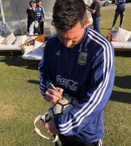 El mejor jugador del planeta, Lionel Messi, tomó con sus manos una pelota de la fábrica “El Pase” de Trenque Lauquen, le estampó una firma como recuerdo indeleble y compartió una foto con todo el plantel, que fue divulgada por a través del sitio y las redes sociales de zoom deportivo.