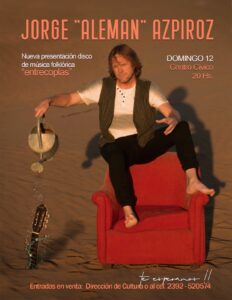 El cantautor Jorge “Aleman” Azpiroz, vuelve a tocar el próximo domingo 12 de noviembre en el Centro Cívico a las 20:00 las canciones de su disco folklórico “Entrecoplas”, grabado en los Estudios “Tierra Viva” y editado por Optix (CABA).