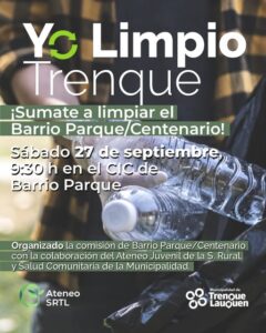 El próximo sábado, desde las 9.30 horas, se realizará una jornada comunitaria de limpieza en el Barrio Parque/Centenario, bajo el lema “Yo limpio Trenque”, organizada por la Comisión Barrial con la colaboración del Ateneo Juvenil de la Sociedad Rural y la Dirección de Salud Comunitaria de la Municipalidad.