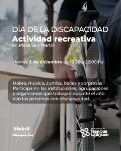 En el marco del Día Internacional de las Personas con Discapacidad –que se conmemora cada 3 de diciembre–, el próximo viernes (5), de 19.30 a 22 en Plaza San Martín, se realizará una jornada recreativa abierta y gratuita para disfrutar en familia. La actividad es organizada por la Oficina para Personas con Discapacidad del Municipio, a cargo de Ana Etchepare, con el acompañamiento de instituciones, agrupaciones y organismos que trabajan durante todo el año en torno a la temática.