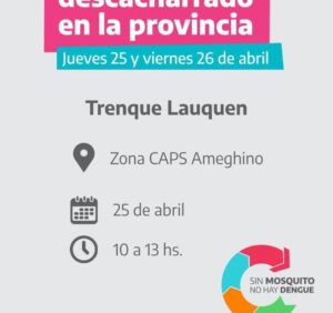 La dirección de Salud Comunitaria del Municipio y Promotores de Salud de Provincia, adhieren a las jornadas de descacharrado impulsadas por el ministerio de Salud bonaerense, que se llevarán a cabo hoy (jueves) y mañana (viernes) en toda la provincia de Buenos Aires con el fin de prevenir el dengue.