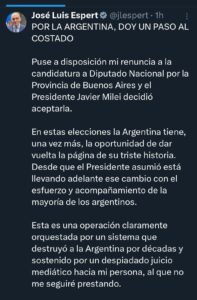 Fue una semana de tensión dentro de la Libertad Avanza y la novela de la candidatura de José Luis Espert terminó como se preveía desde que empezó el escándalo: renuncia de José Luis Espert a su candidatura en la provincia de Buenos Aires. Apunto a que tuvo un “juicio mediático”.